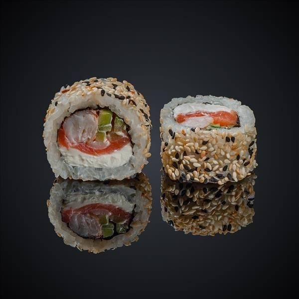 Состав: лосось копченый, креветка, огурец, сыр “Cremette”, кунжут, нори, рис.