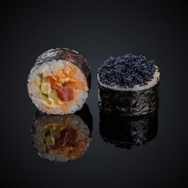 Состав: лосось, огурец, соус “Спайси”, икра “Масаго”, нори, рис.