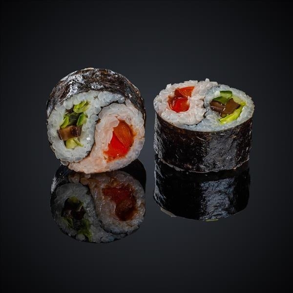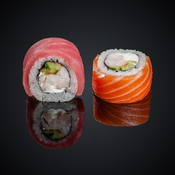 Состав: лосось, тунец, креветка, огурец, сыр “Cremette”, нори, рис.