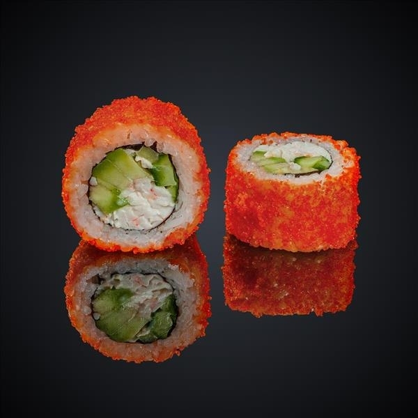 Состав: креветка, авокадо, огурец, майонез, икра “Масаго”, нори, рис.