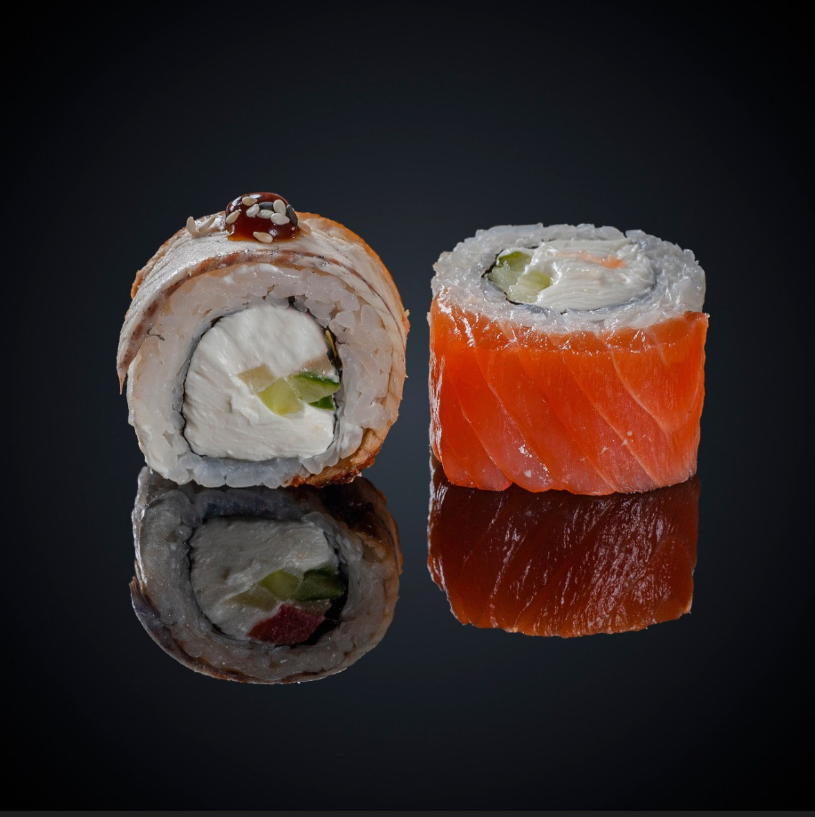 Состав: угорь, лосось, огурец, сыр “Cremette”, соус “Унаги”, нори, рис.