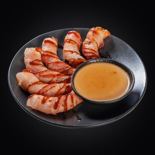 Креветки, бекон, соус «Унаги», кунжут, соус «Сливочный».