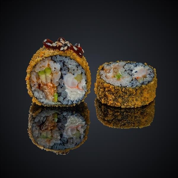 Угорь, креветка, авокадо, огурец, сыр “Cremette”, соус Спайси, соус Унаги, икра Масаго, панировочные сухари, кляр, кунжут, нори, рис.
