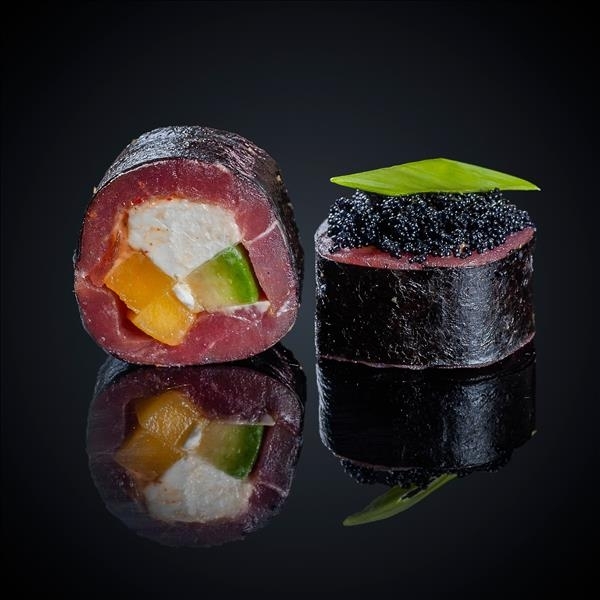 Состав: лосось, тунец, угорь, авокадо, сыр “Cremette”, нори, рис.