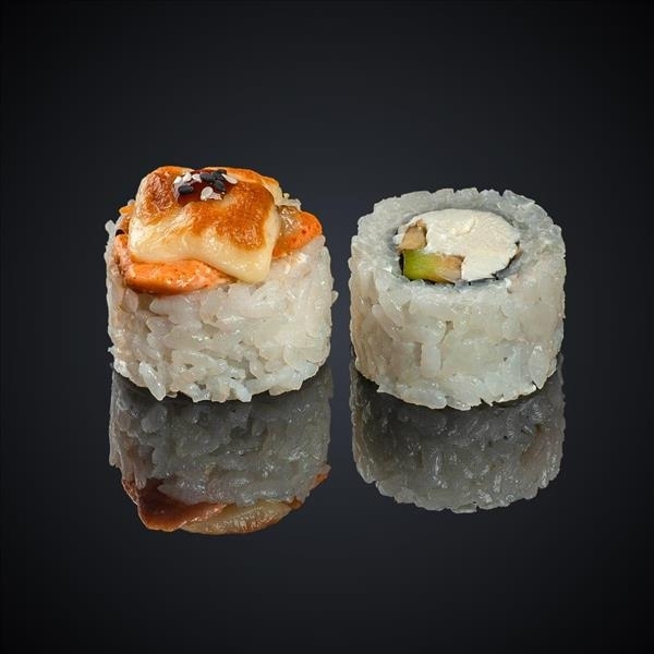 Состав: угорь, лосось, огурец, сыр “Cremette”, соус “Унаги”, нори, рис.
