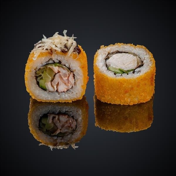 Курица копченая, огурец, салат Айсберг, сыр Пармезан, соус Гавайский, соус Унаги, панировочные сухари, кляр, кунжут, нори, рис.