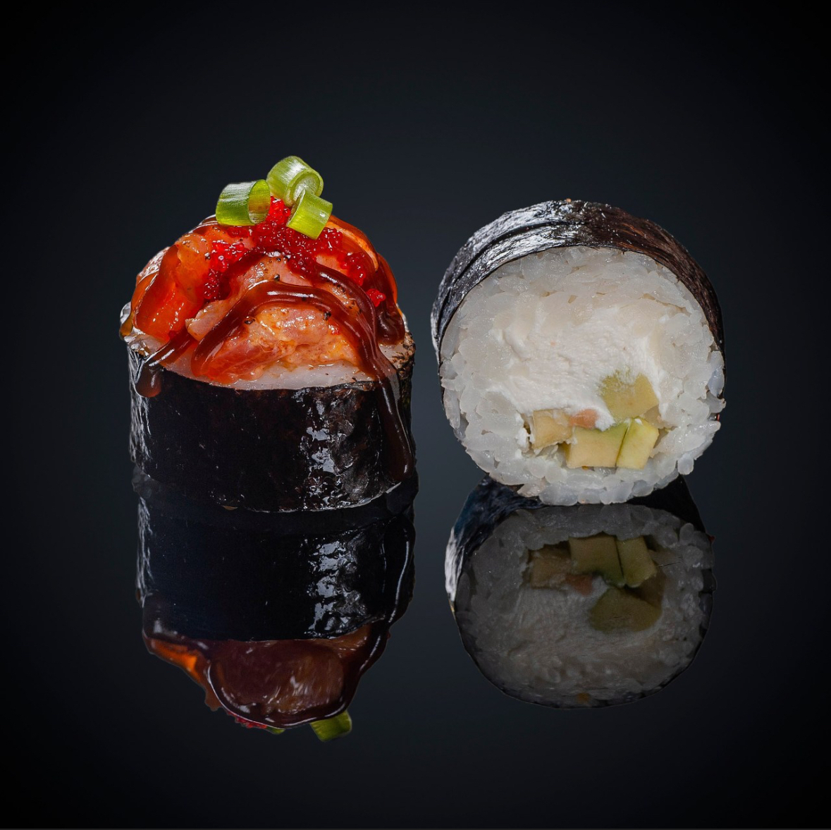 Состав:лосось, авокадо, сыр “Cremette”, икра масаго, соус «Унаги», соус «Спайси», лук зеленый, нори, рис.