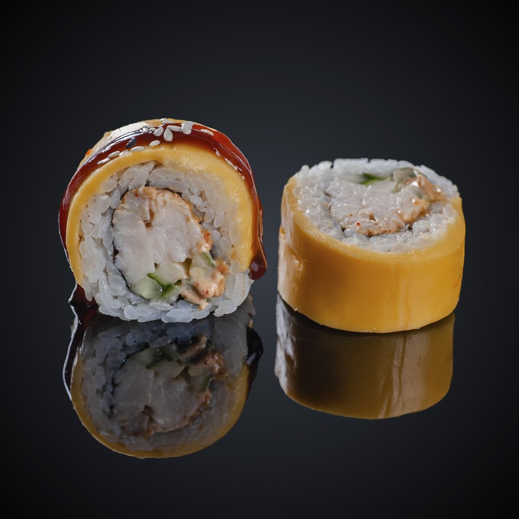 Курица копченая, огурец, сыр “Чеддер, ”сыр “Cremette”, соус “Спайс”, соус “Унаги”, кунжут, нори, рис.