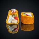 Состав:лосось, авокадо, сыр “Cremette”, икраса масаго, соус «Унаги», соус «Спайси», лук зеленый, нори, рис.