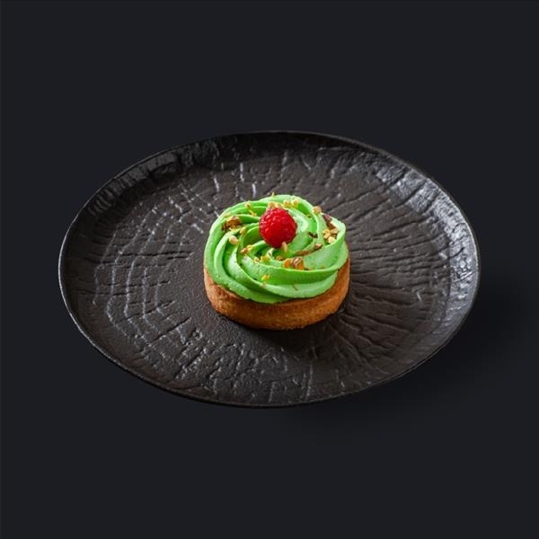 хрустящая миндальная основа с нежным фисташковым франжипаном, слоем кислосладкого малинового конфитюра и шоколадным ганашом, дополненным хрустящей фисташковой крошкой