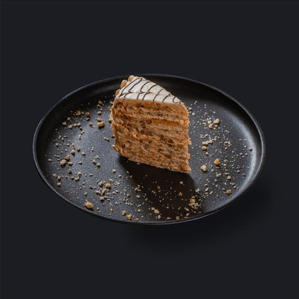 рассыпчатый ореховый бисквит, пропитанный ванильным заварным кремом, с ганашом из белого шоколада и миндальных лепестков
