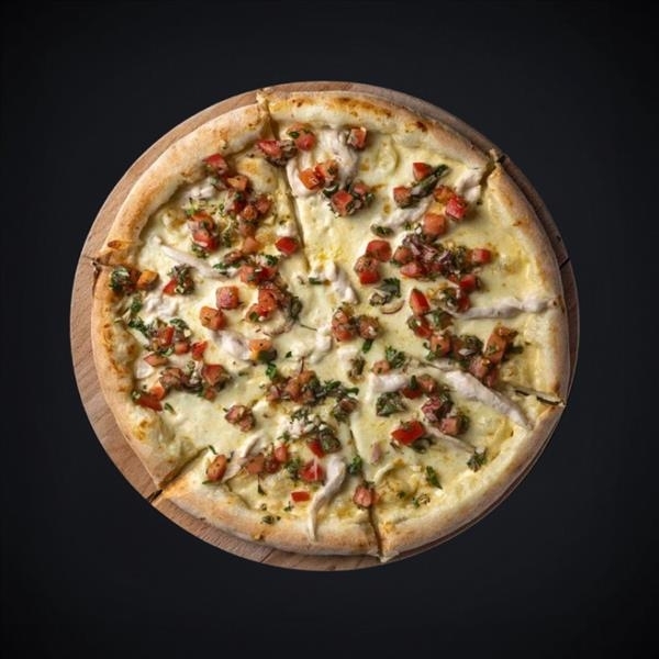 Состав: соус сливочный, сыр «Моцарелла», куриное филе, томаты конкассе.