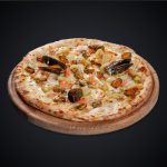 Состав: куриное филе, пепперони, краковская колбаса, охотничьи колбаски, свиной ростбиф, огурцы маринованные, пармезан, моцарелла, лук фри, соус сливочный.