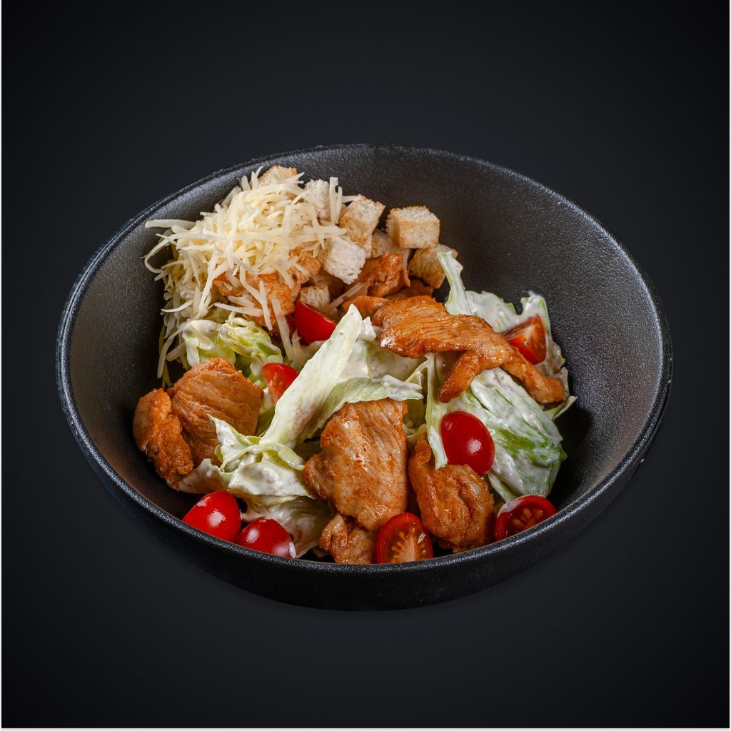 Состав: куриное филе, салат айсберг, Черри, сыр Пармезан, соус «Цезарь», сухарики.