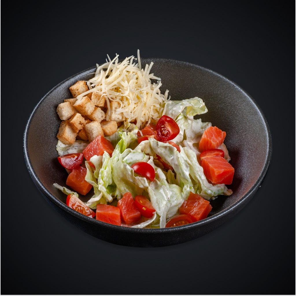 Состав: лосось х/к, салат айсберг, Черри, сыр Пармезан, соус «Цезарь», сухарики.