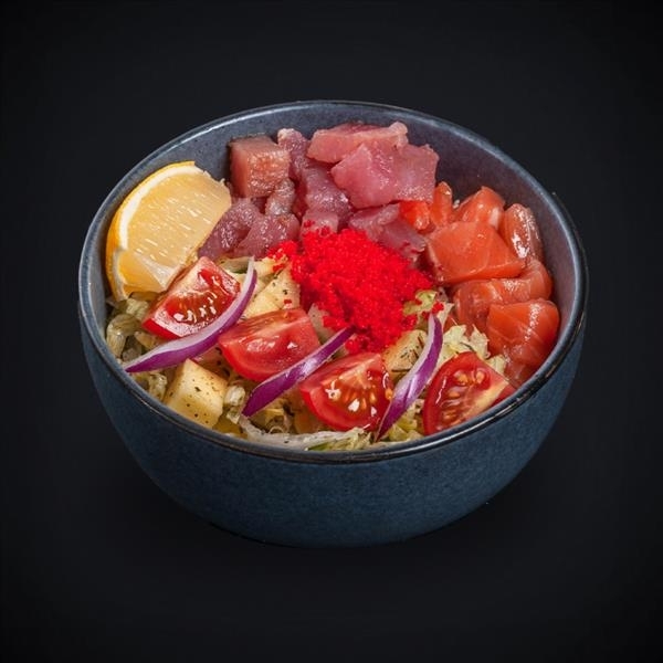 Состав: лосось, тунец, авокадо, огурец, томаты “Черри”, салат “Айсберг”, манго, икра “Масаго”, лук красный, соус “Гавайский”, соус “Соевый”, прованские травы, кунжут, рис.