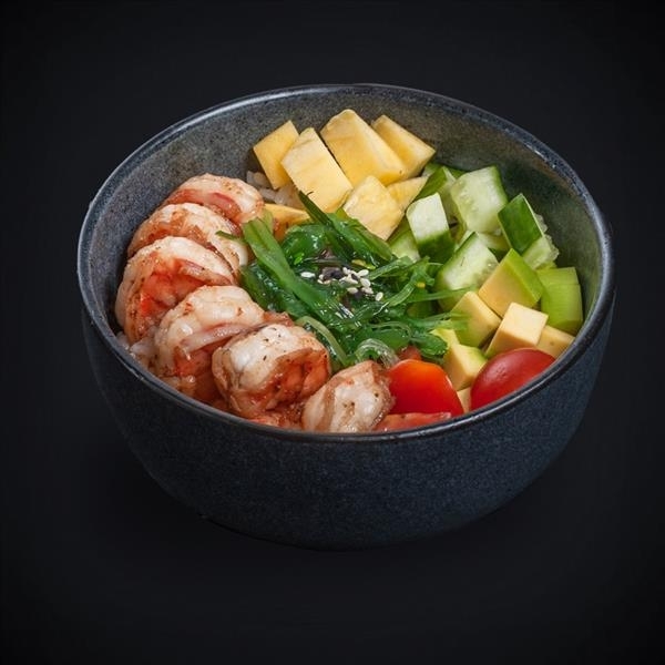 Состав: креветки, авокадо, огурец, томаты “Черри”, салат “Чука”, манго, соус “Гавайский”, соус “Свит чили”, масло оливковое, прованские травы, кунжут, рис.