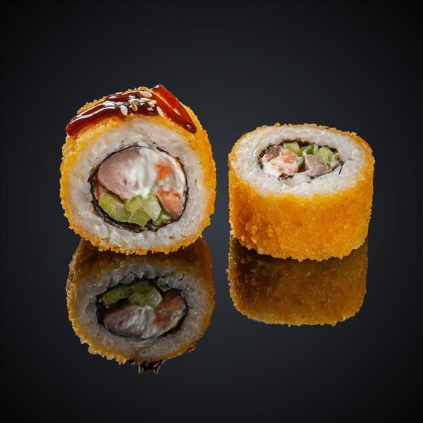 Лосось, тунец, огурец,сыр “Cremette”, соус Гавайский, соус Унаги, панировочные сухари, кляр, кунжут, нори, рис.