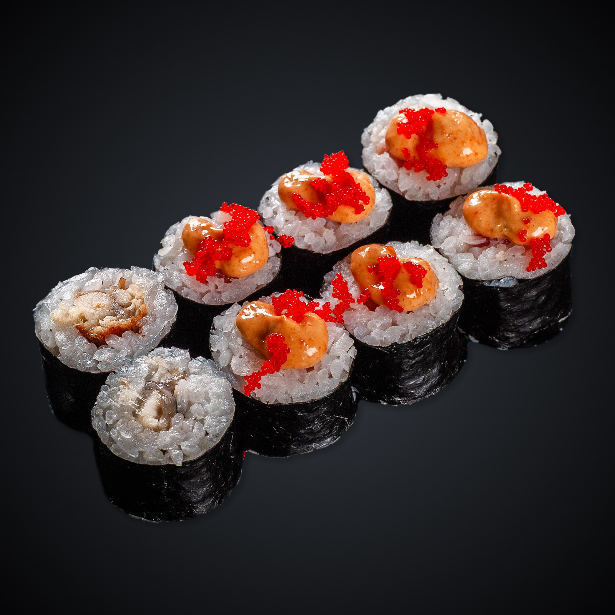 угорь,соус “Спайси”, икра “Масаго”, нори, рис.