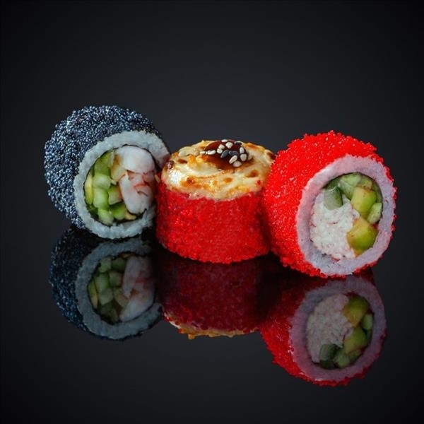 Лосось, авокадо, сыр “Cremette”, сыр “Моцарелла”, соус “Спайси”, соус “Унаги”, кунжут, нори, рис.