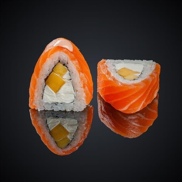 Состав: лосось, манго, сыр “Cremette”, нори, рис.