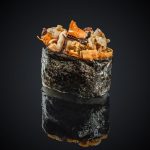 Состав: лосось копченый, тамаго, авокадо, сыр “Cremette”, лук фри, соус “Гавайский”, нори, рис.