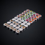 Лосось, авокадо, сыр “Cremette”, сыр “Моцарелла”, соус “Спайси”, соус “Унаги”, кунжут, нори, рис.